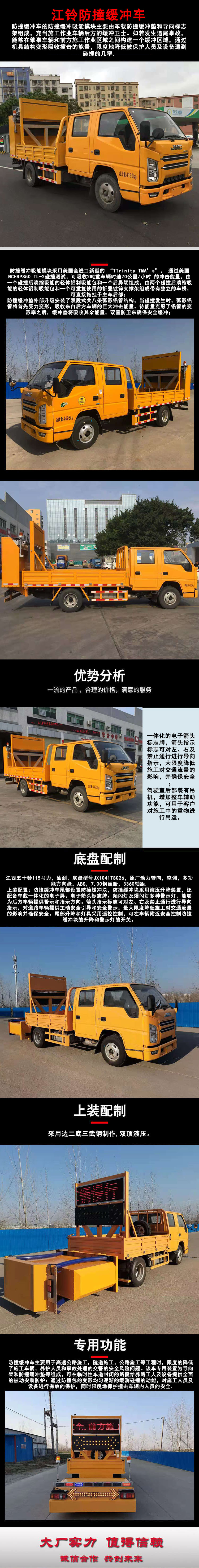 四、其他说明: 货箱:采用Q235国标边3mm底板花纹板4mm厚,箱体后部防撞缓冲模块包采用国际知名技术产品70K防撞缓冲模块,防撞缓冲吸能模块主要由车载防撞缓冲垫和导向标志架组成,充当施工作业车辆后方的缓冲卫士。